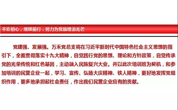 萬禾黨總支部作為桂林市兩新組織黨組織中的一員,在此次培訓(xùn)班上的交流發(fā)言,是桂林市兩新組織黨建工作成果的重要體現(xiàn),是黨建工作的亮點(diǎn)展示,對(duì)于今后做好兩新組織黨建工作起到了積極作用。下一步桂林市將堅(jiān)持貫徹落實(shí)習(xí)近平新時(shí)代中國特色社會(huì)主義思想和黨的十九大精神,把兩新組織特色黨建工作延伸拓展到更多企業(yè)、行業(yè)和街區(qū)中,更好地發(fā)揮黨組織作用,打造獨(dú)具桂林特色的兩新組織黨建工作名片!