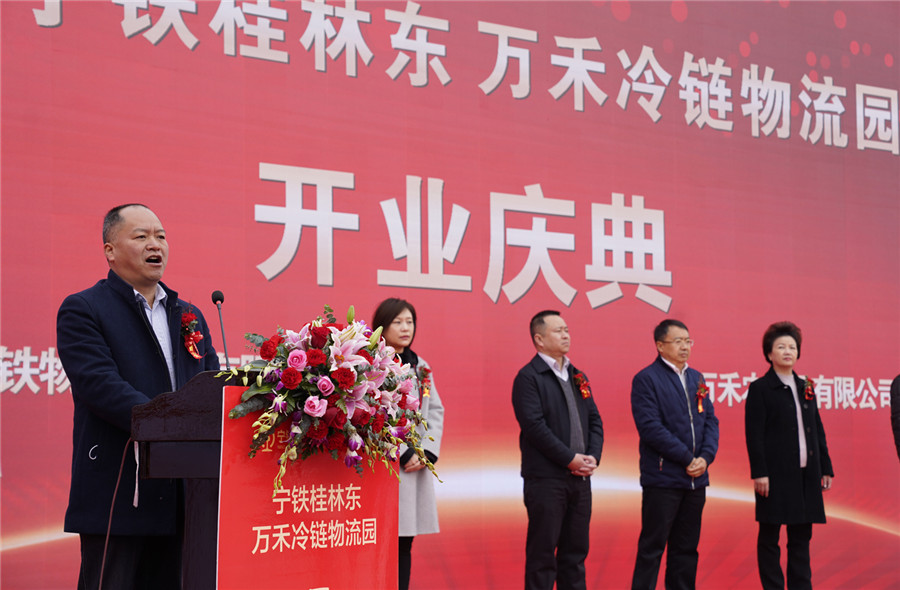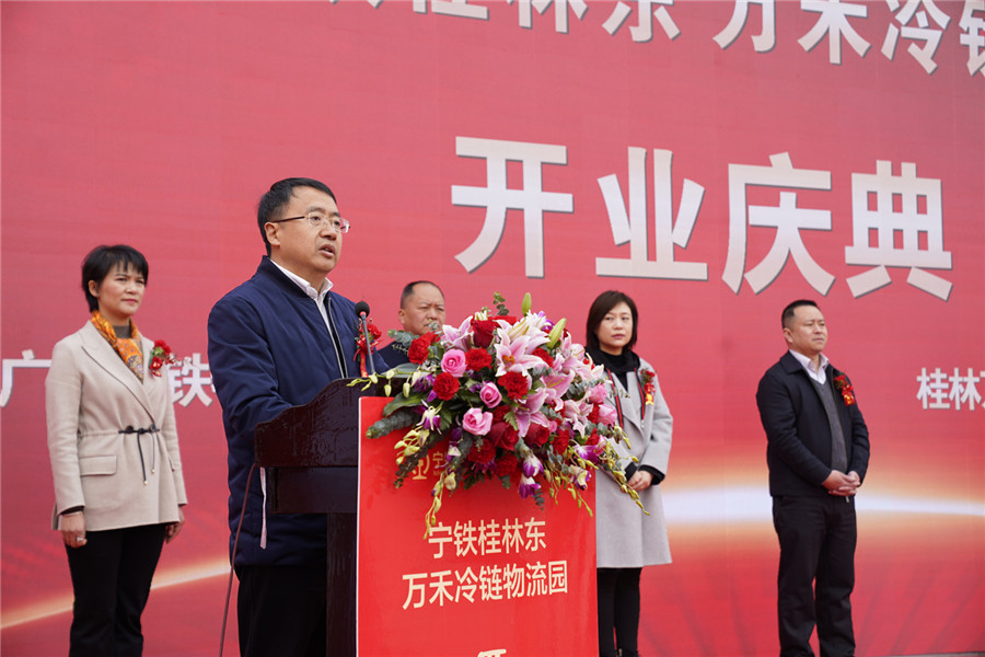 ▲桂林市政府副市長(zhǎng)鐘洪宣布:寧鐵桂林東萬(wàn)禾冷鏈物流園正式開(kāi)園