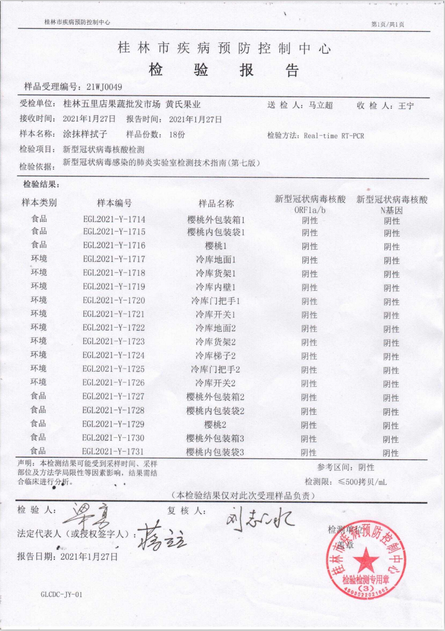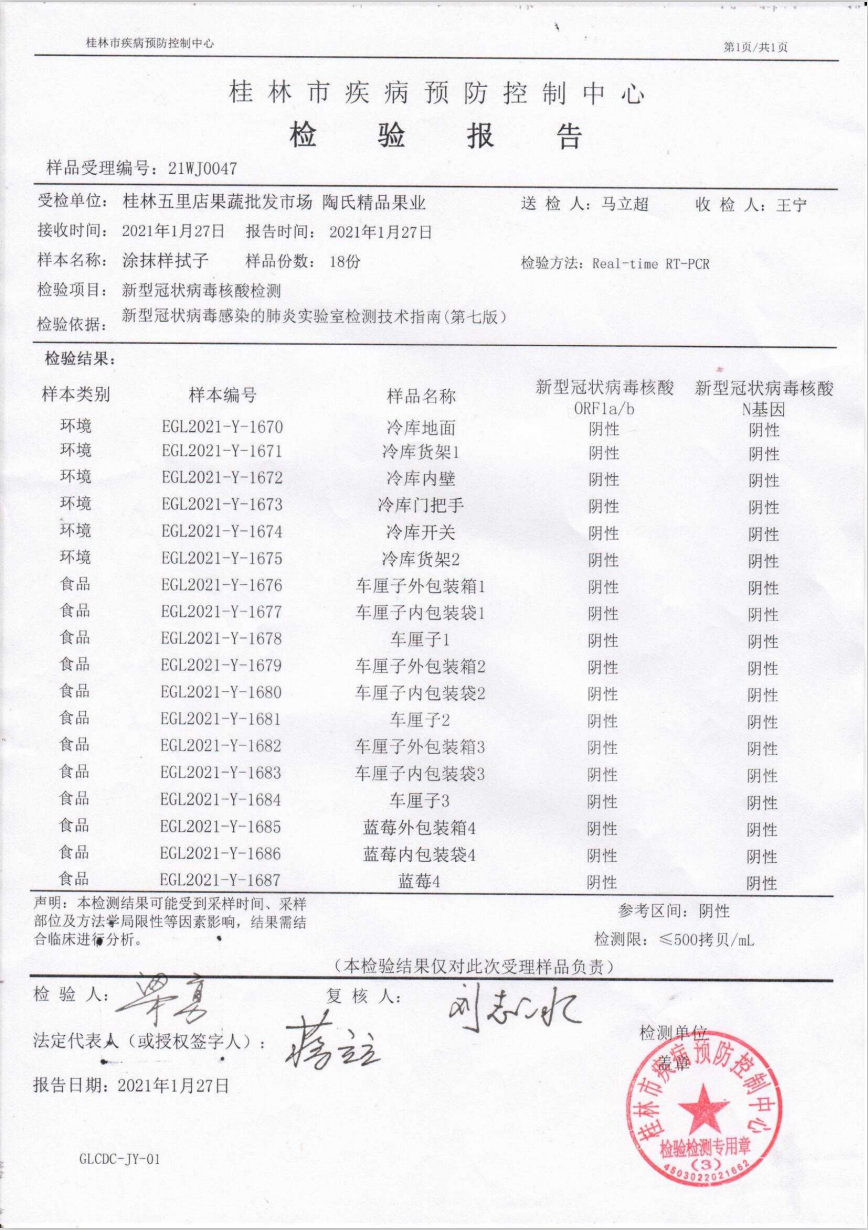 此次共采集食品外包裝箱、內(nèi)包裝袋、食品、冷庫存放進(jìn)口產(chǎn)品區(qū)的地面、貨架和內(nèi)壁、冷庫排風(fēng)扇、門把手、工作長梯、電器開關(guān)、推車、電子秤、從業(yè)人員手部及工作服涂抹樣等樣本共計(jì)80份,抽樣檢測結(jié)果全部呈陰性。
