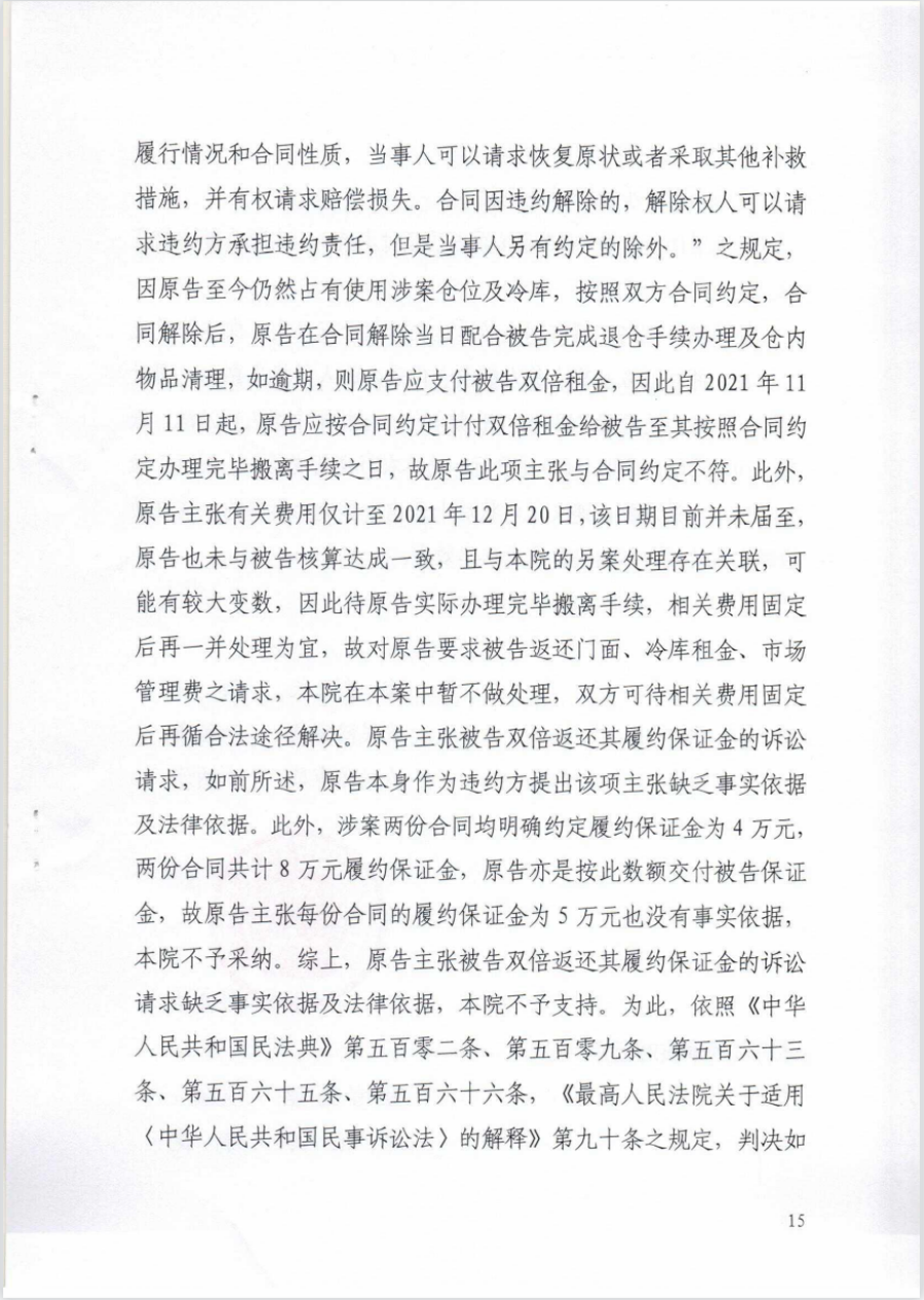 一、原告桂林萬禾市場管理有限責(zé)任公司與被告黃某某于2020年8月25日簽訂的兩份五里店果蔬批發(fā)市場精品果區(qū)倉位租賃合同(涉及10號、11號倉位)于2021年11月10日解除。