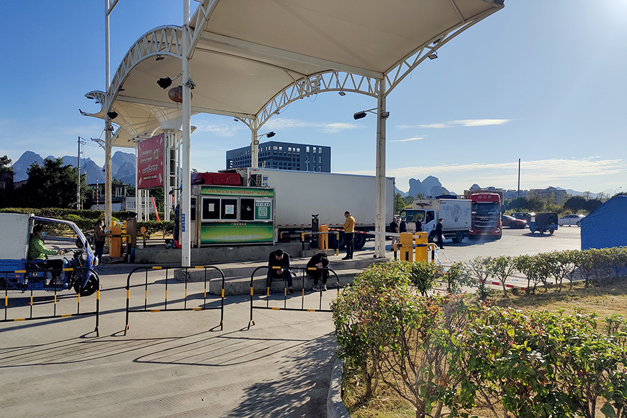 現(xiàn)場工作人員對入場車輛司機和人員的體溫、健康碼、行程碼逐一進行檢查核驗,體溫檢測正常者才允許進入市場交易,進入市場人員必須全程佩戴口罩。外地(桂林市包括12個縣以外)車輛人員進場需持 48 小時內(nèi)核酸陰性證明,并測量體溫,掃碼核驗健康碼、行程碼及登記個人信息。