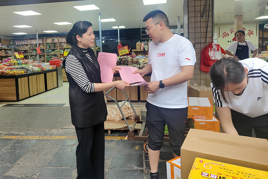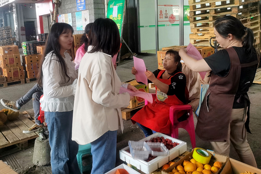 ▲黨員向市場經(jīng)營戶宣導(dǎo)文明出行的重要性