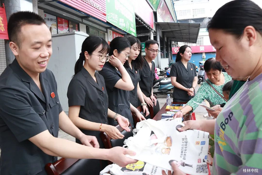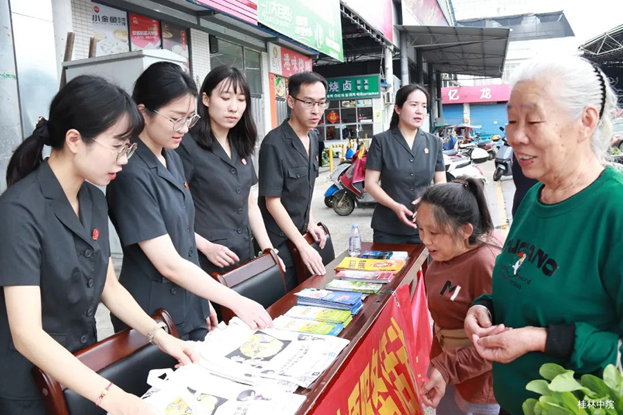 隨后,桂林中院、七星法院組織青年干警志愿者與萬禾集團(tuán)黨員代表及青年員工來到五里店果蔬批發(fā)市場(chǎng),面向市場(chǎng)的商戶、顧客進(jìn)行法律宣傳,現(xiàn)場(chǎng)解答群眾法律問題,提供法律咨詢,發(fā)放掃黑除惡、防范電信網(wǎng)絡(luò)詐騙等方面的法律宣傳資料。