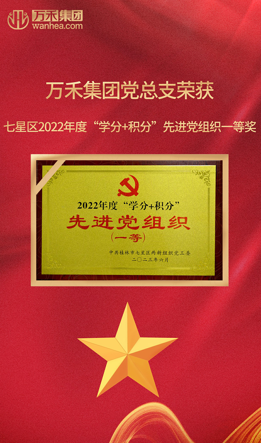 6月28日,在七星區(qū)兩新組織黨工委開展的“不忘初心跟黨走 昂揚(yáng)奮進(jìn)新征程”迎“七一”活動(dòng)中,萬禾集團(tuán)黨總支獲授2022年度桂林市兩新組織黨建工作示范點(diǎn)榮譽(yù)稱號和七星區(qū)兩新組織黨工委2022年度“學(xué)分+積分”一等獎(jiǎng)!
