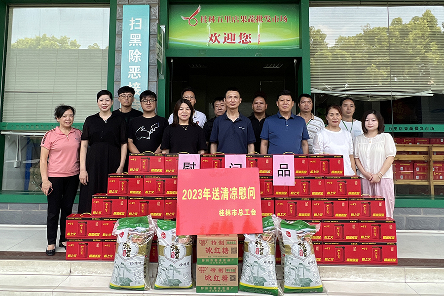 酷暑盛夏,近日桂林高溫持續(xù),為切實做好高溫天氣安全生產(chǎn)保障工作,積極關(guān)愛職工夏日健康,7月27日,桂林市總工會、七星區(qū)總工會到桂林五里店果蔬批發(fā)市場走訪慰問廣大一線職工,并現(xiàn)場發(fā)放清涼飲品、綠豆、紅糖等防暑降溫物品,為一線工作者送去組織的關(guān)心和夏日的清涼。桂林市總工會黨組成員、副主席周世偉,桂林市總工會網(wǎng)宣部部長蔣淑芳,桂林萬禾農(nóng)產(chǎn)品有限公司工會主席陶辛有參加慰問活動。