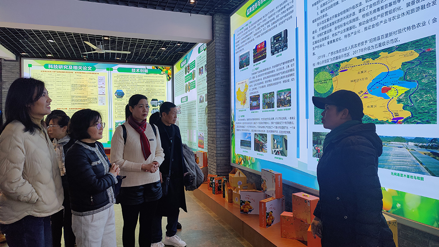 ▲黨員干部們認(rèn)真聆聽賴玉梅介紹金桔特色產(chǎn)業(yè)